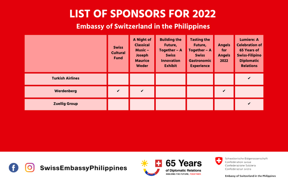 In line with the FDFA Guidelines on Partnering with Sponsors to increase external transparency about the partnerships entered into by Switzerland’s embassies and consulates abroad, we are providing a list of the current-year sponsorship partners and the corresponding events.