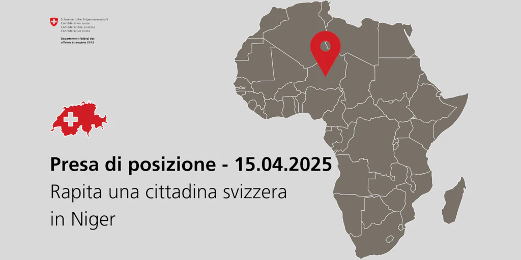 Il DFAE è stato informato del rapimento di una cittadina svizzera in Niger ed è in contatto con i familiari. Il DFAE è anche in contatto con le autorità nigerine, in quanto responsabili delle ricerche in questo caso. Per motivi di protezione dei dati e della personalità, non possono essere rese note ulteriori informazioni sulla vittima o sui familiari.